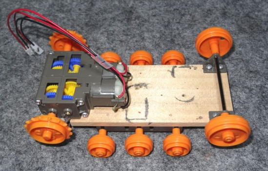 「ダブルギヤーボックス」は、タンクの車体に写真6のようにを取り付けました。写真7がタンク全体を組上げた側面の状態です。 2枚のプレートには配線を楽にするために、コネクタが容易に通る大きさの穴をあけています。 因みに、使用した3本のケーブル付きコネクタは、DCモーター制御ボードを購入した時の付属品です。