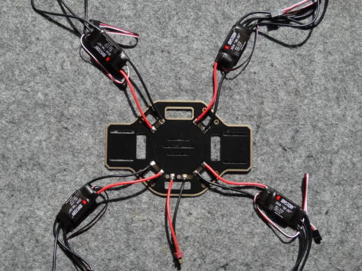 写真7はESCを4個とNAVIO2のパワーモジュール接続用コネクタをプレートへハンダ付けをした状況です。 写真8はフレームにブラシレスモータ(980KV)をそれぞれ取付状態です。 一応、全体の仮組込みをした状態が写真9ですが、写真10のプロペラはオートパイロットシステムがまともに機能するようになるまでは取り付けません。