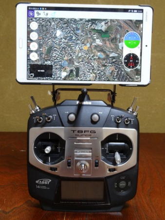 写真5、6は、タブレットホルダーをFUTABAの送信機T8FG(14CHモード)に取り付けた状態の写真です。 タブレットが8.4インチで結構大きめですので、いろいろ検討しました結果、取りあえずは中華製を購入し、MediaPad M3ケースをマジックテープで張り付けて、写真7のようにタブレットをそのケースへはめ込む方法で固定しています。