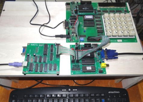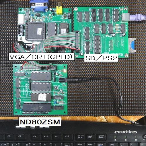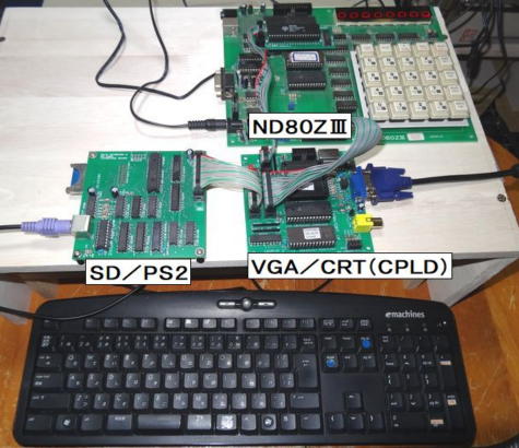 ND80ZVをベースに、以前にキット購入しましたマイコン独立セットの「SDカード・PS/2キーボード ・IFボード」、及び今回購入の「CPLD版 VGA/CRT ・IFボード」を写真5のように接続し、ディスプレイとPS/2キーボードをそれぞれ接続しましたました。