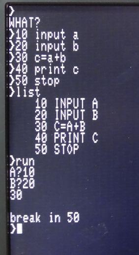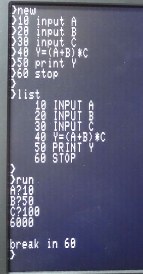 「I/O」・「8」のキーを同時に押して、BASICを起動させると写真6のように7セグのLEDは全消灯となり、ディスプレにはプロンプトが表示されますので、PS/2キーボードからテストプログラムを入力して、作動テストを行いました結果が写真7で、正常に作動しました。