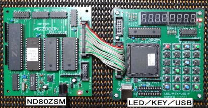 写真2のようにND80ZSMボードと「CPLD版 LED/KEY/USB」ボードを接続するだけで、最もシンプルなTK80互換システムが出来上がります。