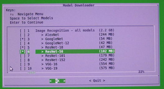 cmakeが終了すると、写真4のようにネットワークを選択してインストール画面が表示され、デフォルトではGoogleNetとResNet-18が選択(「*」印)されている。 参考資料に準じてResNet-50もインストールしました。