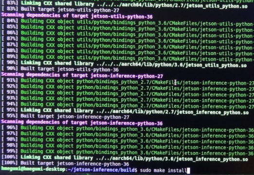 再度、jetson-inferenceディレクトリへ移動し、ビルド用のbuildディレクトリを作成後、cmake。 $ cd jetson-inference $ mkdr build $ cd build $ cmake ../