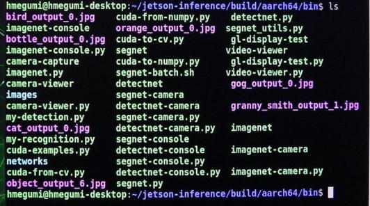 準備は以上で完了し、実行ファイルはjetson-inference/buildnの下のaarch64/binに置かれているので、そこにカレントディレクトリを移して、ビルドで作成されたファイルを確認したのが写真7です。