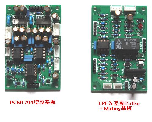 の「PCM1704増設基板」と「LPF&差動Buffer+Muting基板」です。