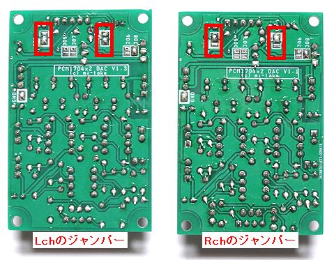 のように、Lchのジャンパーは、J01、J02ともに写真上では下側の接続となり、Rchは両方とも上側の接続となります。 尚、設定変更にはハンダごてが必要です。