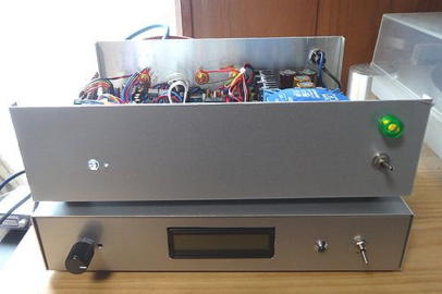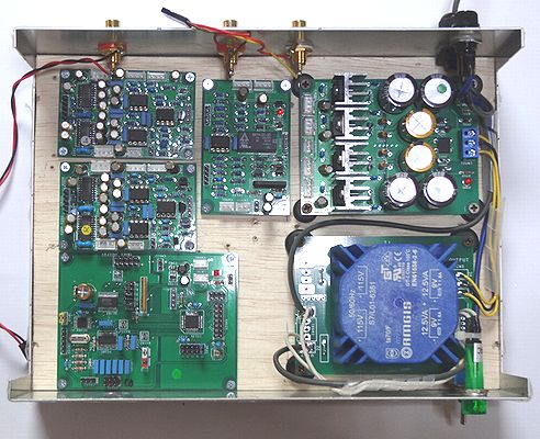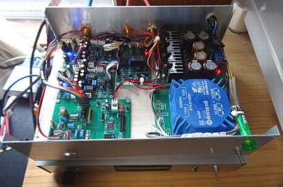 は、試聴の準備が完了し、電源を投入した直後の状況で、各ボードのLEDは点灯しています。 ボリュームの付いていた穴はまだそのままです。