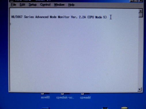 コントロールボードを使用するためには、先ずは、資料P97〜101に従い、付属CDのライターソフトを使ってモニタデバッガソフト「MODE5」をフラッシュメモリへ書き込みます。 写真6は定電圧電源(電池でもOK)を含めた全体の接続状態で、電源はDC6V〜7V程度、使用したターミナルソフトは、お馴染みの「Tera Term Pro」です。 写真7は、書き込んだモニタデバッガが正常に作動するかテストした画面で、結果はモニタデバッガの開始メッセージが表示されました。