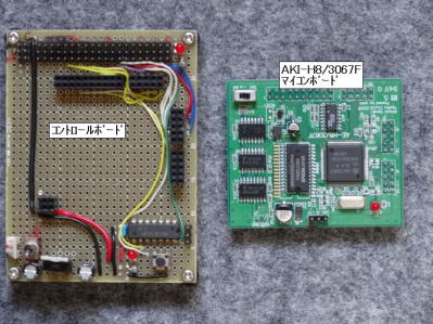 写真2が今回、製作したコントロールボードです。 資料に従い、現状では13個のサーボをコントロールするように配線しています。 写真3は、コントロールボードをベース部分とAKI−H8/3967Fボードを切り離した状態の写真です。